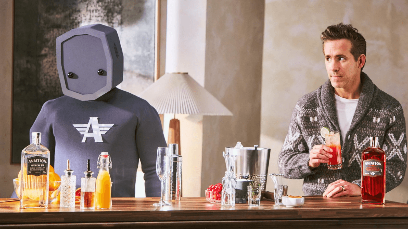 The headline ad spot lays out a classic “promise → problem → product” narrative. Viewers first meet “AVO,” a supposed state-of-the-art robotic bartender introduced by Reynolds: “a state-of-the-art robotic humanoid engineered to be your home mixologist”. AVO dutifully attempts to mix gin cocktails - but fails spectacularly, spilling liquor and smashing glassware due to obvious human limitations (he “cannot see through his costume”). At that point Reynolds dryly delivers the pivot: “when the robot turned out to be a person in a suit, we innovated again.” Cut to the new gin bottle, and Reynolds cheerfully declares, “it makes amazing cocktails practically by itself”.