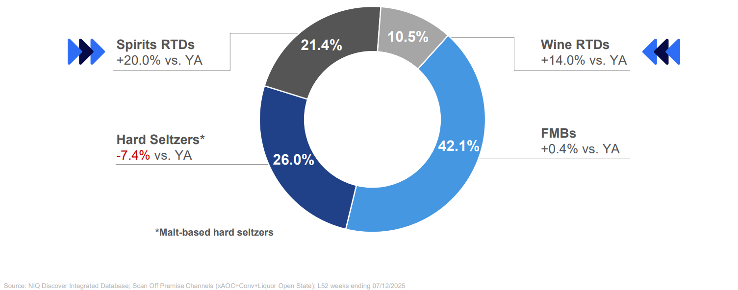 Many RTD subcategories are reaching maturity. The overall RTD growth is decelerating and innovation is slower. In particular, the hard seltzer craze has cooled: hard seltzers are down -7.4% in the latest period, whereas spirits-based RTDs are up +20% and wine-based RTDs +14%. This indicates a shake-out of once-hot niches.